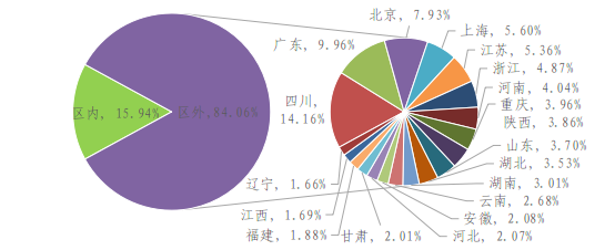 (四)热门客源地省份游客占比。区外游客占比高于区内游客占比,为84.06%,区内占15.94%。区外热门客源地省份依次为四川、广东、北京、上海和江苏等。其中四川游客占比最高、达14.16%,广东和北京位列其后,分别为9.96%和7.93%。